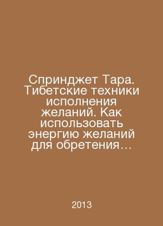 Sprinkle Tara: Tibetan Techniques for Fulfilling Wish. How to Use the Energy of Wish for True Happiness and Love. In Russian /Sprindzhet Tara. Tibetskie tekhniki ispolneniya zhelaniy. Kak ispolzovat energiyu zhelaniy dlya obreteniya istinnogo schastya i lyubvi. M., Sofia. 2013. Contact us for details or to request photos of available books. Delivery of this book could take longer than normal due to additional handling time before shipping, and no rush delivery options are available. Please let us know if you have a specific date by which you need to receive your order. SKUalbb35fd95ec6092028