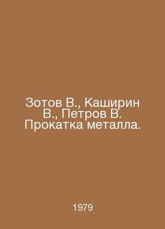 Zotov V., Kashirin V., Petrov V. Metal rolling. In Russian /Zotov V., Kashirin V., Petrov V. Prokatka metalla. Metallurgy 1979. Contact us for details or to request photos of available books. Delivery of this book could take longer than normal due to additional handling time before shipping, and no rush delivery options are available. Please let us know if you have a specific date by which you need to receive your order.SKUalbb374b73b59835018