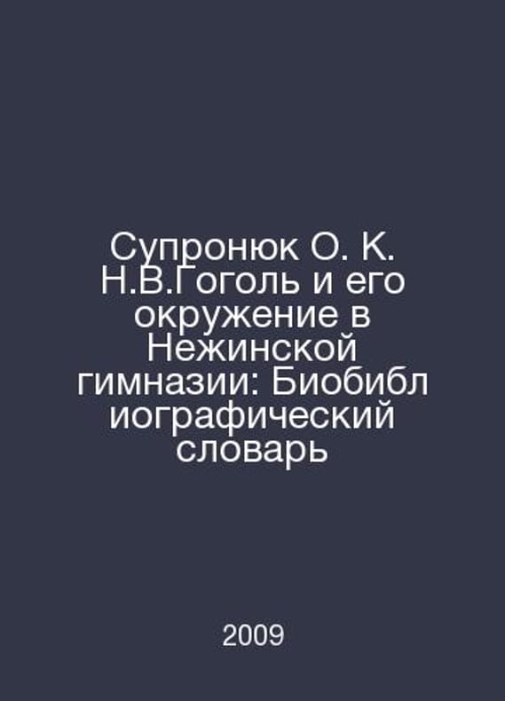 Supronyuk O.K. N.V.Gogol and his entourage at Nezhyn Gymnasium: Bibliographic Dictionary In Russian /Supronyuk O. K. N.V.Gogol i ego okruzhenie v Nezhinskoy gimnazii: Biobibliograficheskiy slovar Revised by A.S. Onishchenko, scientific editor A.I. Reitblat, presented by Y.V.Mann Kyiv Academic Periodicum 2009. Contact us for details or to request photos of available books. Delivery of this book could take longer than normal due to additional handling time before shipping, and no rush delivery options are available. Please let us know if you have a specific date by which you need to receive your order. SKUalbb5a9c284e9260452