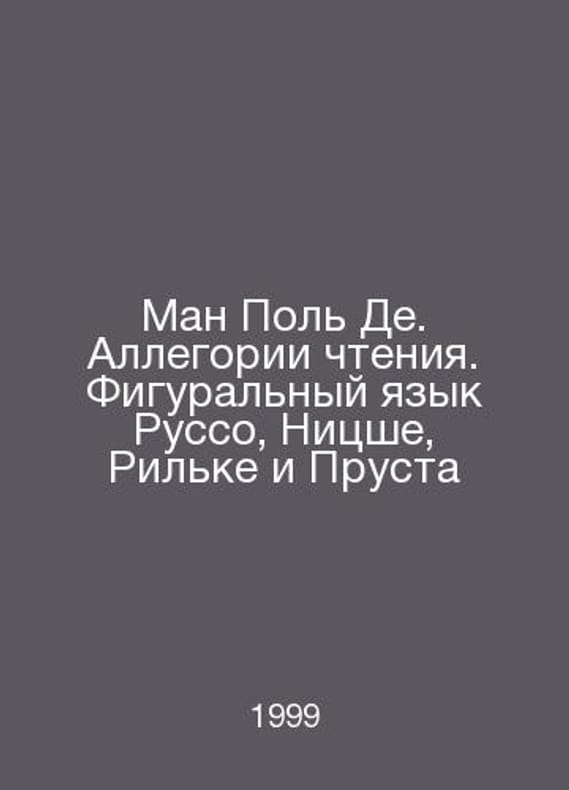 Man Paul De. Allegories of Reading: The Figurative Language of Rousseau, Nietzsche, Rilke, and Proust In Russian /Man Pol De. Allegorii chteniya. Figuralnyy yazyk Russo, Nitsshe, Rilke i Prusta Series: Studio humanitatis Ekaterinburg Ural University 1999. Contact us for details or to request photos of available books. Delivery of this book could take longer than normal due to additional handling time before shipping, and no rush delivery options are available. Please let us know if you have a specific date by which you need to receive your order. SKUalbb66352023240bb63