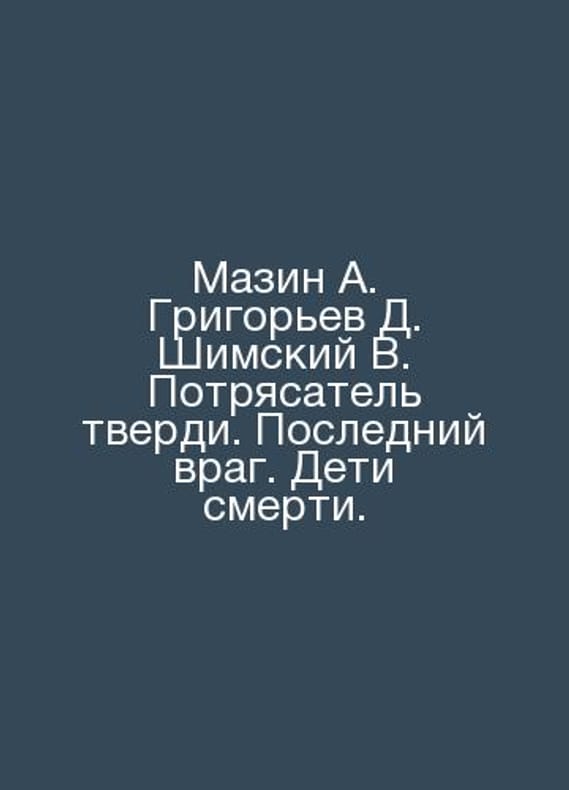Mazin A. Grigoryev D. Shimsky V. The Stunner of Soil. The Last Enemy. Children of Death. In Russian /Mazin A. Grigorev D. Shimskiy V. Potryasatel tverdi. Posledniy vrag. Deti smerti. The World of Astya. St. Petersburg Northwest. 1994-95.Contact us for details or to request photos of available books. Delivery of this book could take longer than normal due to additional handling time before shipping, and no rush delivery options are available. Please let us know if you have a specific date by which you need to receive your order.SKUalbb69028f6ddb4ae15