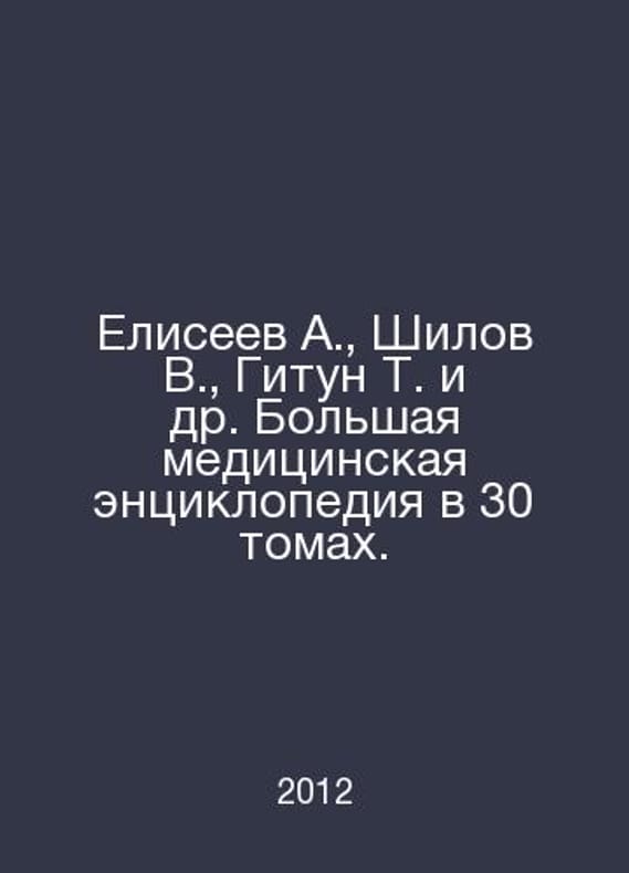 Eliseev A., Shilov V., Gitun T. et al. A large medical encyclopedia in 30 volumes. In Russian /Eliseev A., Shilov V., Gitun T. i dr. Bolshaya meditsinskaya entsiklopediya v 30 tomakh. Moscow ARIA-AIF 2012.Contact us for details or to request photos of available books. Delivery of this book could take longer than normal due to additional handling time before shipping, and no rush delivery options are available. Please let us know if you have a specific date by which you need to receive your order.SKUalbb6dd201a80ec73b6