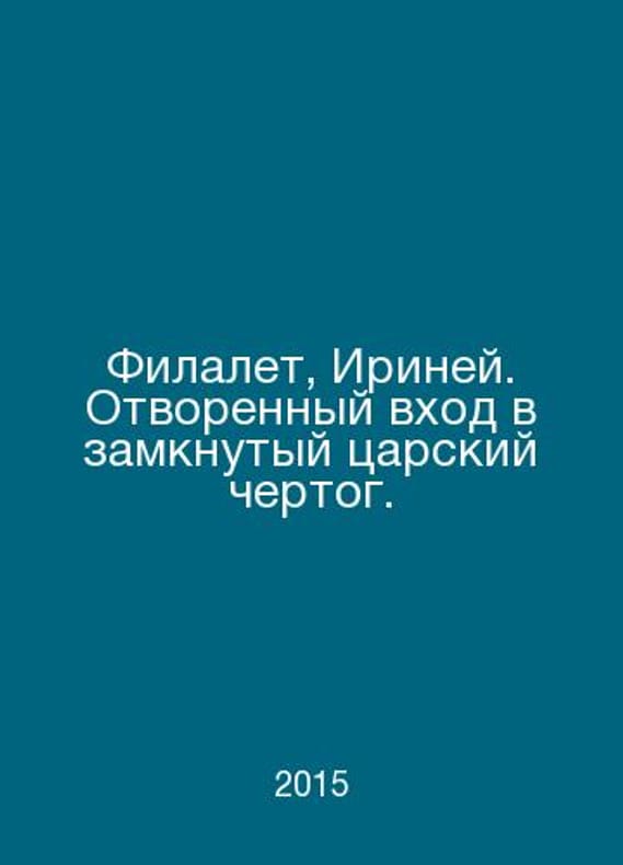 Filalet, Irineus. An open entrance to the closed imperial palace. In Russian /Filalet, Iriney. Otvorennyy vkhod v zamknutyy tsarskiy chertog. Translation from Anguis Gleb Butuzov. Moscow Enigma 2015. Contact us for details or to request photos of available books. Delivery of this book could take longer than normal due to additional handling time before shipping, and no rush delivery options are available. Please let us know if you have a specific date by which you need to receive your order. SKUalbb869ce864ffb6896