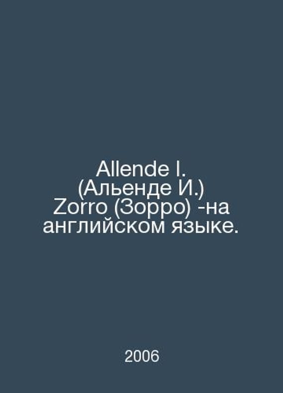 Allende I. (Allende I.) Zorro (Zorro) In Russian /Allende I. (Alende I.) Zorro (Zorro) -na angliyskom yazyke. London Harper Perennial 2006.Contact us for details or to request photos of available books. Delivery of this book could take longer than normal due to additional handling time before shipping, and no rush delivery options are available. Please let us know if you have a specific date by which you need to receive your order.SKUalbbcbd024a022fba0d