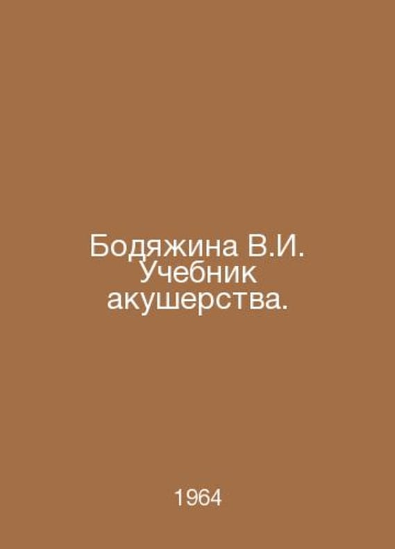 Bodyguard V.I. Tutorial for Midwifery. In Russian /Bodyazhina V.I. Uchebnik akusherstva. M. Medicine. 1964.Contact us for details or to request photos of available books. Delivery of this book could take longer than normal due to additional handling time before shipping, and no rush delivery options are available. Please let us know if you have a specific date by which you need to receive your order.SKUalbbcd8f0ac4d523b84