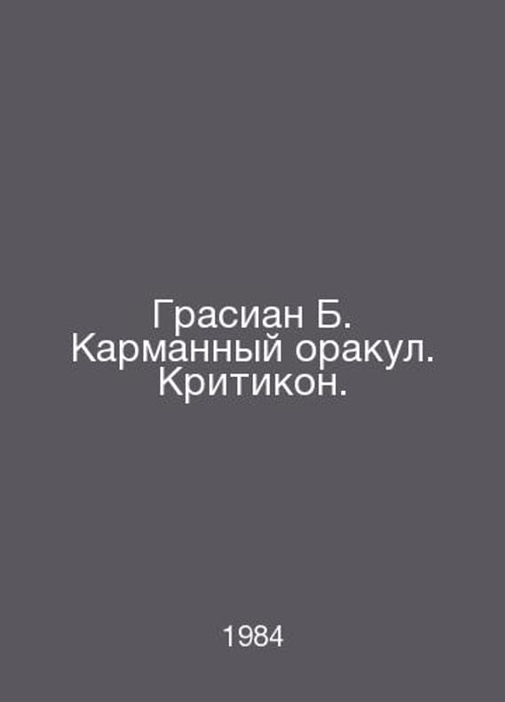 Grazian B. The Pocket Oracle. Criticon. In Russian /Grasian B. Karmannyy orakul. Kritikon. Series: PL (literary monuments) M. Science 1984.Contact us for details or to request photos of available books. Delivery of this book could take longer than normal due to additional handling time before shipping, and no rush delivery options are available. Please let us know if you have a specific date by which you need to receive your order.SKUalbbd4a3a2f22b9f936