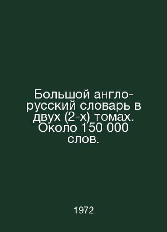 Large English-Russian Dictionary in two (2) volumes. About 150,000 words. In Russian /Bolshoy anglo-russkiy slovar v dvukh (2-kh) tomakh. Okolo 150 000 slov. Under the general guidance of Prof. I. R. Halperin, PhD. M. Soviet Encyclopedia 1972.. Contact us for details or to request photos of available books. SKUalbbdce32ed669a3339.