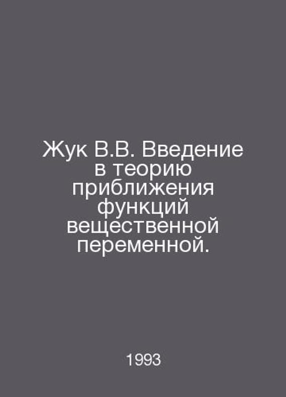 Beetle V.V. Introduction to the theory of approximation of functions of a material variable. In Russian /Zhuk V.V. Vvedenie v teoriyu priblizheniya funktsiy veshchestvennoy peremennoy. SPB SPBGU 1993.Contact us for details or to request photos of available books. Delivery of this book could take longer than normal due to additional handling time before shipping, and no rush delivery options are available. Please let us know if you have a specific date by which you need to receive your order.SKUalbbf8522157cbff6c7