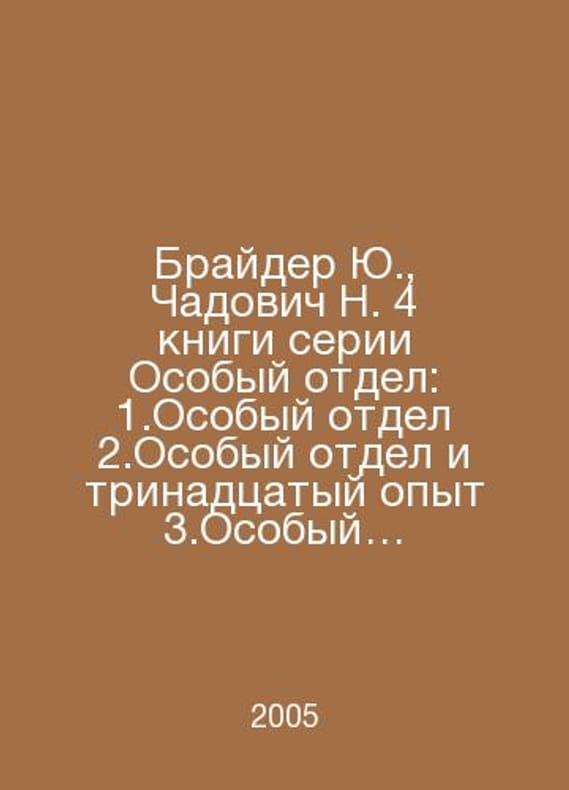 Brider Yu., Chadovich N. 4 books series Special Department: 1 Special Department 2 Special Department and thirteenth experience 3 Special Department and Ash of the Ark 4 Special Department and the Eye of the Devil In Russian /Brayder Yu., Chadovich N. 4 knigi serii Osobyy otdel: 1.Osobyy otdel 2.Osobyy otdel i trinadtsatyy opyt 3.Osobyy otdel i pepel kovchega 4.Osobyy otdel i oko dyavola Series: The Absolute Weapons of M. Exmo 2005-2006. Contact us for details or to request photos of available books. Delivery of this book could take longer than normal due to additional handling time before shipping, and no rush delivery options are available. Please let us know if you have a specific date by which you need to receive your order.SKUalbc05242daa7f6d931