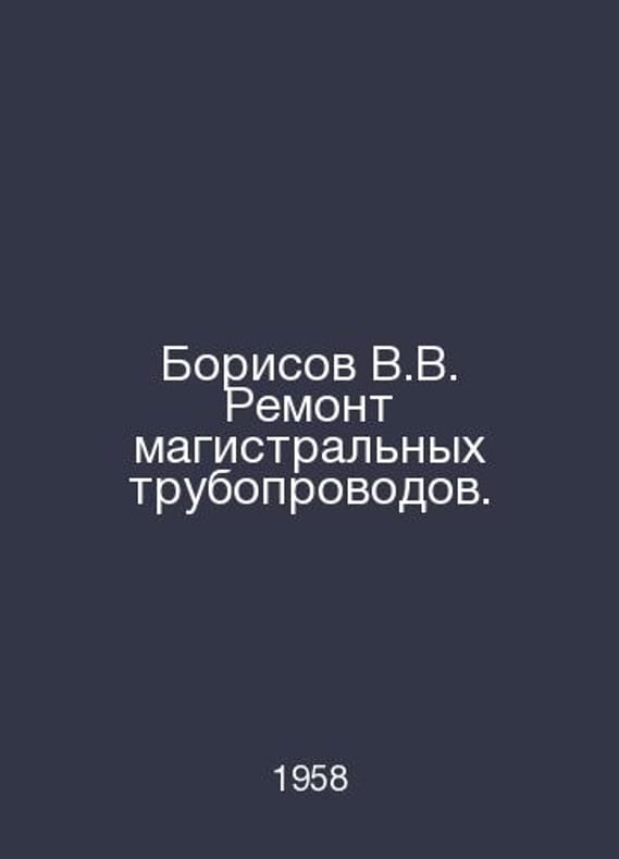 Borisov V.V. Repair of main pipelines. In Russian /Borisov V.V. Remont magistralnykh truboprovodov. M. Gostoptekhizdat. 1958. Contact us for details or to request photos of available books. Delivery of this book could take longer than normal due to additional handling time before shipping, and no rush delivery options are available. Please let us know if you have a specific date by which you need to receive your order.SKUalbc08fd06e2491f10b