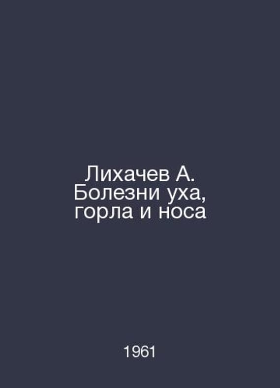 Likhachev A. Diseases of the ear, throat and nose In Russian /Likhachev A. Bolezni ukha, gorla i nosa M Medgiz. 1961.Contact us for details or to request photos of available books. Delivery of this book could take longer than normal due to additional handling time before shipping, and no rush delivery options are available. Please let us know if you have a specific date by which you need to receive your order.SKUalbc0f7c0896abe492d