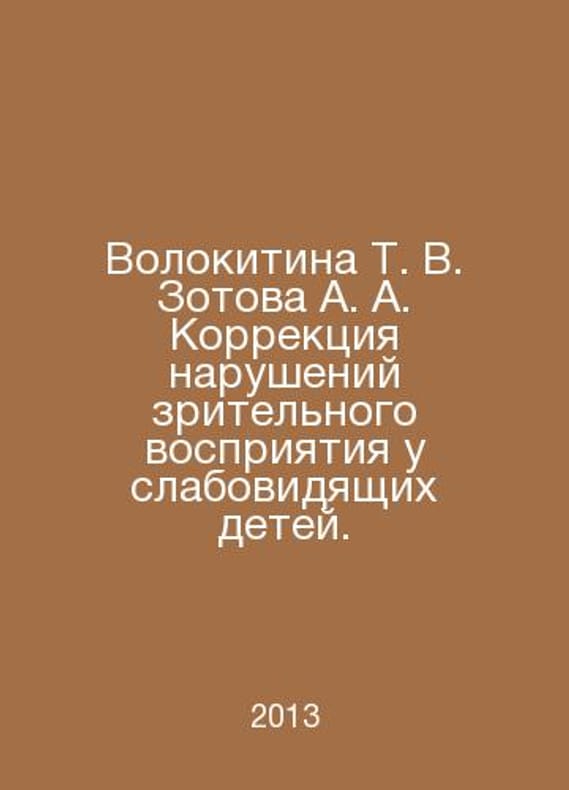 Volokitina T. V. Zotova A. A. Correction of visual perception disorders in visually impaired children. In Russian /Volokitina T. V. Zotova A. A. Korrektsiya narusheniy zritelnogo vospriyatiya u slabovidyashchikh detey. Teaching and Methodological Manual Arkhangelsk Kira 2013.Contact us for details or to request photos of available books. Delivery of this book could take longer than normal due to additional handling time before shipping, and no rush delivery options are available. Please let us know if you have a specific date by which you need to receive your order.SKUalbc2813bf9a4b8efd4