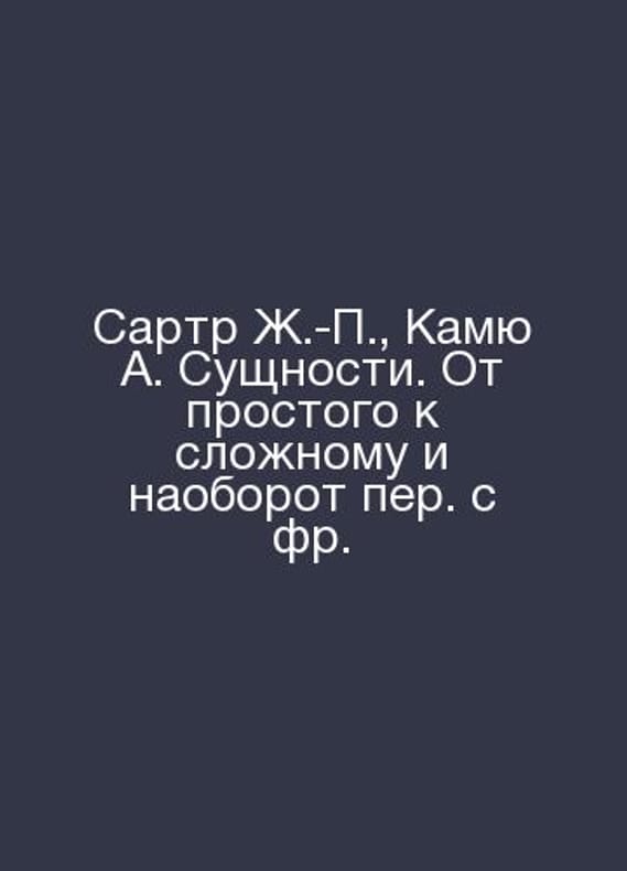 Sartre J.-, Camus A. Entities. From simple to complex and vice versa. In Russian /Sartr Zh.-, Kamyu A. Sushchnosti. Ot prostogo k slozhnomu i naoborot per. s fr. M. Rodina 2021. 288s.Contact us for details or to request photos of available books. Delivery of this book could take longer than normal due to additional handling time before shipping, and no rush delivery options are available. Please let us know if you have a specific date by which you need to receive your order.SKUalbc60ae105d13cccba