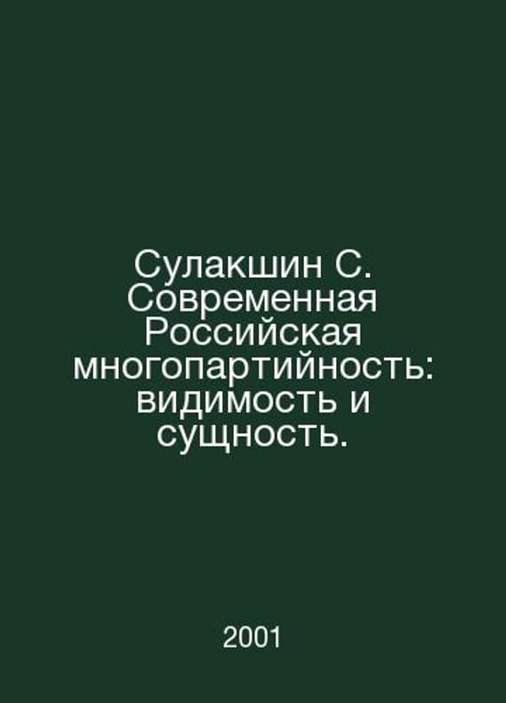 Sulakshin S. Modern Russian Multiparty: Visibility and Entity. In Russian /Sulakshin S. Sovremennaya Rossiyskaya mnogopartiynost: vidimost i sushchnost. The testimony is not from M. Thought 2001. Contact us for details or to request photos of available books. Delivery of this book could take longer than normal due to additional handling time before shipping, and no rush delivery options are available. Please let us know if you have a specific date by which you need to receive your order.SKUalbc758ebc7176784b9