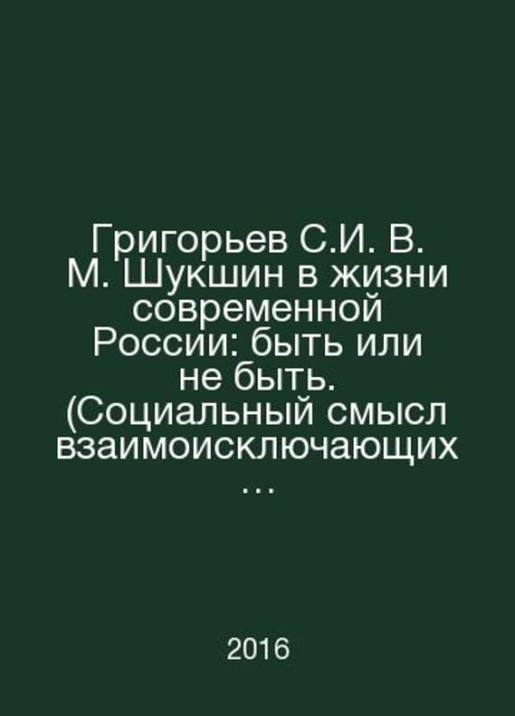 Grigoryev S.I. V. Shukshin in the life of modern Russia: to be or not to be. (The social meaning of mutually exclusive tendencies in the development of the interest of the Russian public at the beginning of the 21st century in the personality and creativity of V.M.Shukshin). In Russian /Grigorev S.I. V. M. Shukshin v zhizni sovremennoy Rossii: byt ili ne byt. (Sotsialnyy smysl vzaimoisklyuchayushchikh tendentsiy v razvitii interesa rossiyskoy obshchestvennosti nachala XXI veka k lichnosti i tvorchestvu V.M.Shukshina). Foreword: A.D. Zabolotskiy. Circulation 300 copies of Moscow: Rusaki, 2016. Contact us for details or to request photos of available books. Delivery of this book could take longer than normal due to additional handling time before shipping, and no rush delivery options are available. Please let us know if you have a specific date by which you need to receive your order. SKUalbc798b59a705fb348