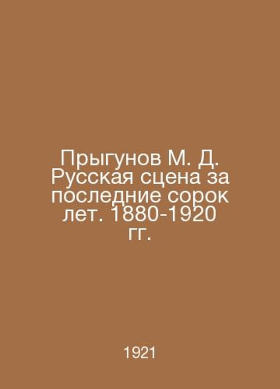 Jumpers M. D. Russian scene for the last forty years. 1880-1920. In Russian /Prygunov M. D. Russkaya stsena za poslednie sorok let. 1880-1920 gg. Series: Questions of Art. Program of Public Lectures. Kazan. State Publishing House. Kazan Branch. 1921.. Contact us for details or to request photos of available books. SKUalbc9acb6818e7ad462.