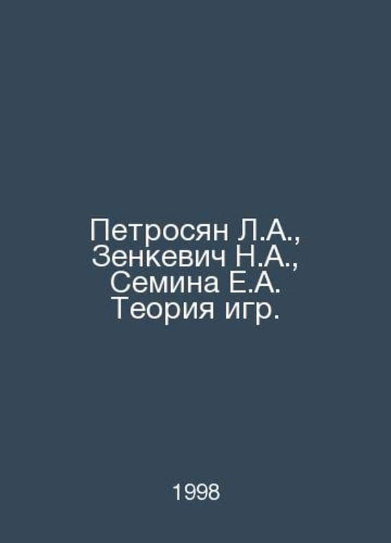 Petrosyan L.A., Zenkevich N.A., Semina E.A. Game Theory. In Russian /Petrosyan L.A., Zenkevich N.A., Semina E.A. Teoriya igr. M. Graduate School 1998.Contact us for details or to request photos of available books. Delivery of this book could take longer than normal due to additional handling time before shipping, and no rush delivery options are available. Please let us know if you have a specific date by which you need to receive your order.SKUalbca8f28108eee3867