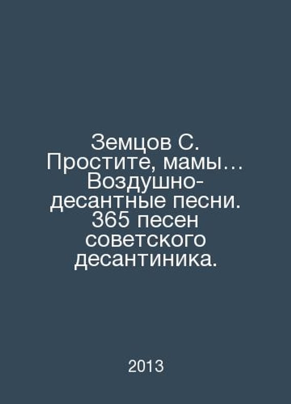 Zemtsov S. Sorry, moms. Airborne songs. 365 songs by a Soviet paratrooper. In Russian /Zemtsov S. Prostite, mamy Vozdushno-desantnye pesni. 365 pesen sovetskogo desantinika. Yekaterinburg. Ural worker. 2013 year. Contact us for details or to request photos of available books. Delivery of this book could take longer than normal due to additional handling time before shipping, and no rush delivery options are available. Please let us know if you have a specific date by which you need to receive your order.SKUalbcc322d61fe455179