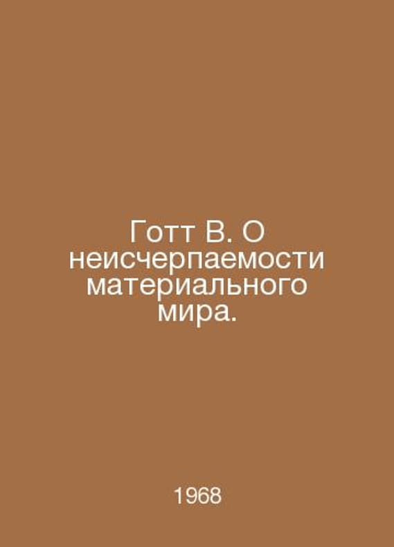 Gott W. On the inexhaustibility of the material world. In Russian /Gott V. O neischerpaemosti materialnogo mira. M knowledge 1968. Contact us for details or to request photos of available books. Delivery of this book could take longer than normal due to additional handling time before shipping, and no rush delivery options are available. Please let us know if you have a specific date by which you need to receive your order.SKUalbcc53bda07e31b6b2