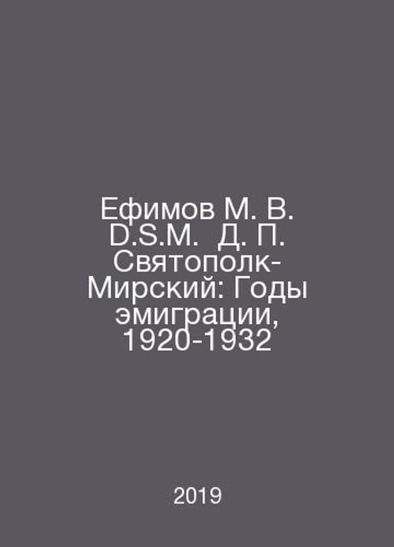Efimov M. V. D.S.M. D. Svyatopolk-Mirsky: The Years of Emigration, 1920-1932 In Russian /Efimov M. V. D.S.M. D. Svyatopolk-Mirskiy: Gody emigratsii, 1920-1932 St. Petersburg Nestor-History 2019. Contact us for details or to request photos of available books. Delivery of this book could take longer than normal due to additional handling time before shipping, and no rush delivery options are available. Please let us know if you have a specific date by which you need to receive your order. SKUalbcc76d6938d484901