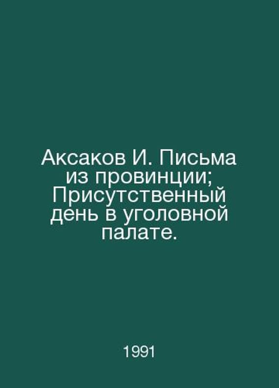 "Aksakov I. Letters from the province; Present day in the criminal chamber. In Russian /Aksakov I. Pisma iz provintsii; Prisutstvennyy den v ugolovnoy palate. M Truth 1991. Contact us for details or to request photos of available books. Delivery of this book could take longer than normal due to additional handling time before shipping, and no rush delivery options are available. Please let us know if you have a specific date by which you need to receive your order. SKUalbccff239b5273395b"
