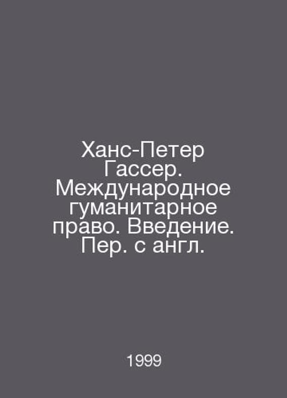 Hans-Peter Gasser: International Humanitarian Law. Introduction. In Russian /Khans-Peter Gasser. Mezhdunarodnoe gumanitarnoe pravo. Vvedenie. Per. s angl. M., International Red Cross Committee. 1999.Contact us for details or to request photos of available books. Delivery of this book could take longer than normal due to additional handling time before shipping, and no rush delivery options are available. Please let us know if you have a specific date by which you need to receive your order.SKUalbcd3ba62bd4f69bcf