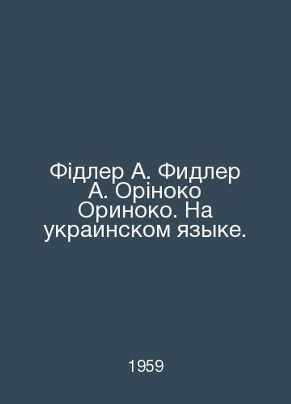 Fidler A. Fidler A. Orinoko Orinoko. In Ukrainian. In Russian /Fidler A. Fidler A. Orinoko Orinoko. Na ukrainskom yazyke. Series: Bibliotechnology of the Benefits of Science Fiction. Kyiv. Young people. 1959.Contact us for details or to request photos of available books. Delivery of this book could take longer than normal due to additional handling time before shipping, and no rush delivery options are available. Please let us know if you have a specific date by which you need to receive your order.SKUalbcdc42a6b8b5821ae