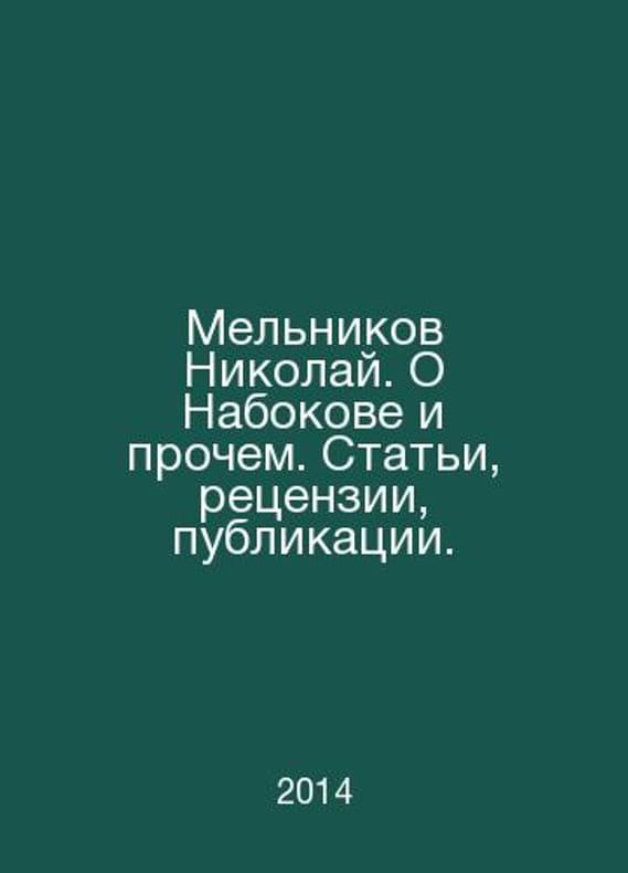 Melnikov Nikolai. About Nabokov and other things. Articles, reviews, publications. In Russian /Melnikov Nikolay. O Nabokove i prochem. Stati, retsenzii, publikatsii. Series: Scientific Library. Moscow: New Literary Review, 2014. Contact us for details or to request photos of available books. Delivery of this book could take longer than normal due to additional handling time before shipping, and no rush delivery options are available. Please let us know if you have a specific date by which you need to receive your order. SKUalbd0582ec67c0da48d