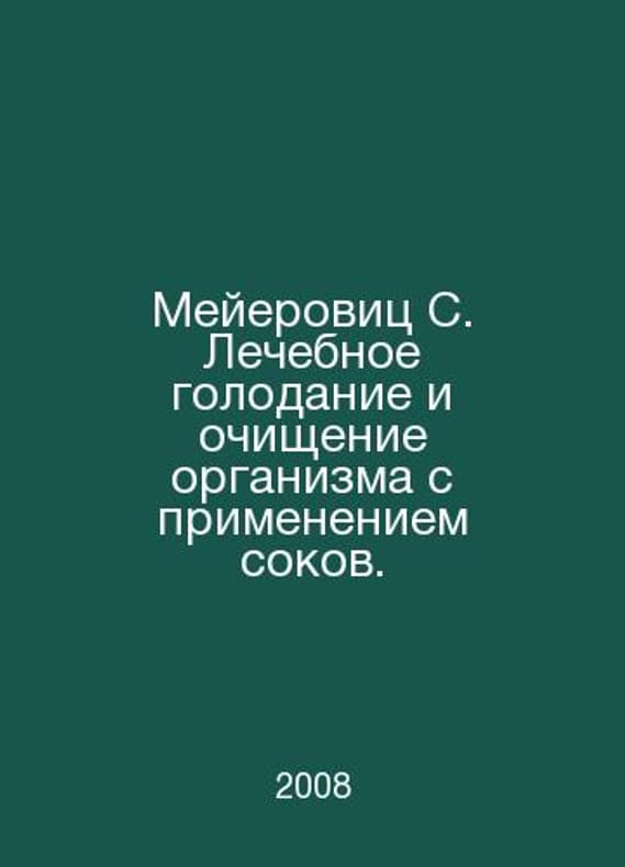 Meyerowitz C. Healing fasting and juice purification. In Russian /Meyerovits S. Lechebnoe golodanie i ochishchenie organizma s primeneniem sokov. Minsk Popurri 2008. Contact us for details or to request photos of available books. Delivery of this book could take longer than normal due to additional handling time before shipping, and no rush delivery options are available. Please let us know if you have a specific date by which you need to receive your order.SKUalbd1c55225fb46b9b1
