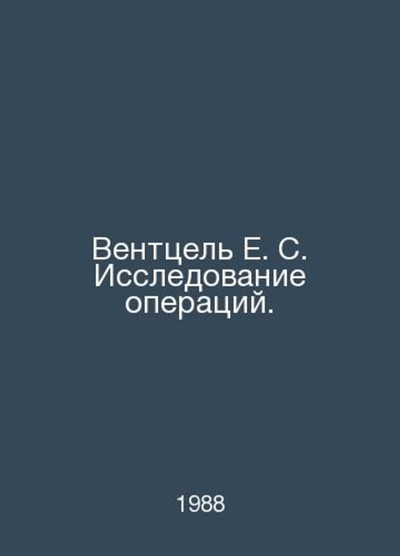 Wentzel E. S. Transaction Research. In Russian /Venttsel E. S. Issledovanie operatsiy. M. Science 1988.Contact us for details or to request photos of available books. Delivery of this book could take longer than normal due to additional handling time before shipping, and no rush delivery options are available. Please let us know if you have a specific date by which you need to receive your order.SKUalbd1c92b9df6f9de13