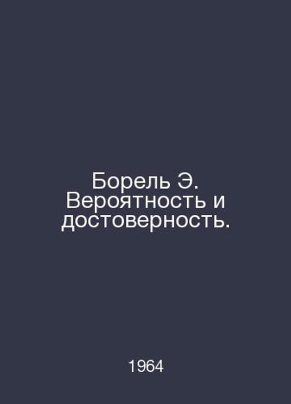 Borel E. Likelihood and Reliability. In Russian /Borel E. Veroyatnost i dostovernost. Science 1964.Contact us for details or to request photos of available books. Delivery of this book could take longer than normal due to additional handling time before shipping, and no rush delivery options are available. Please let us know if you have a specific date by which you need to receive your order.SKUalbd1e68cc9ddc8eb73