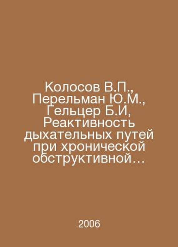 Kolosov V., Perelman Y.M., Geltzer B.I., Respiratory reactivity in chronic obstructive pulmonary disease. In Russian /Kolosov V., Perelman Yu.M., Geltser B.I, Reaktivnost dykhatelnykh putey pri khronicheskoy obstruktivnoy bolezni legkikh. Vladivostok Dalnauka 2006.. Contact us for details or to request photos of available books. SKUalbd3ccdd66c4e514d3.
