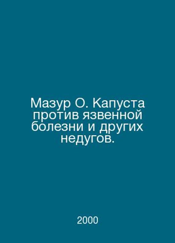 Mazur O. Cabbage against ulcers and other ailments. In Russian /Mazur O. Kapusta protiv yazvennoy bolezni i drugikh nedugov. SPB 2000. Contact us for details or to request photos of available books. Delivery of this book could take longer than normal due to additional handling time before shipping, and no rush delivery options are available. Please let us know if you have a specific date by which you need to receive your order.SKUalbd45d50746904c5c1