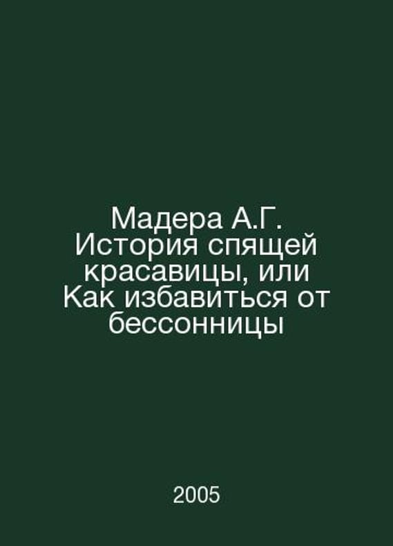 Madera A.G. The Story of the Sleeping Beauty, or How to Get Out of Insomnia In Russian /Madera A.G. Istoriya spyashchey krasavitsy, ili Kak izbavitsya ot bessonnitsy M Exmo 2005. Contact us for details or to request photos of available books. Delivery of this book could take longer than normal due to additional handling time before shipping, and no rush delivery options are available. Please let us know if you have a specific date by which you need to receive your order.SKUalbd6e6c48e7aaed79e