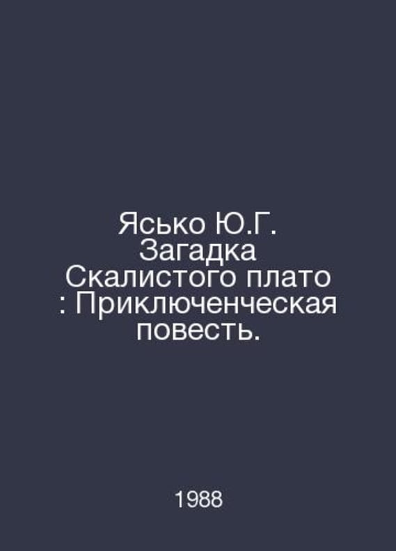 Yasko Yu.G. The Rocky Plateau Mystery: An Adventure Tale. In Russian /Yasko Yu.G. Zagadka Skalistogo plato: Priklyuchencheskaya povest. The Adventure Tale. Ordzhonikidze. Ir. 1988.Contact us for details or to request photos of available books. Delivery of this book could take longer than normal due to additional handling time before shipping, and no rush delivery options are available. Please let us know if you have a specific date by which you need to receive your order.SKUalbd8842f0024fb1d6f