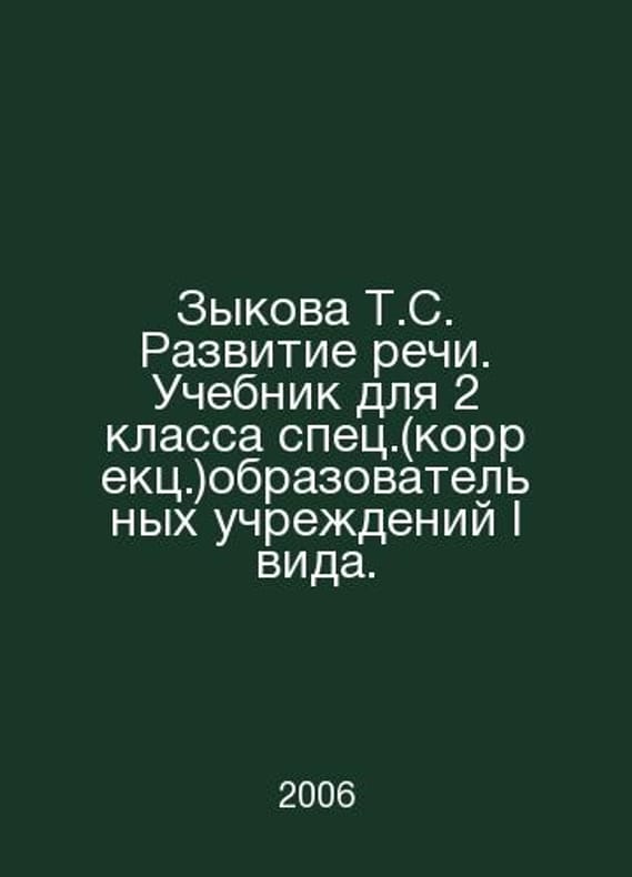 Zykova T.S. Speech Development. Textbook for the 2nd grade of special education institutions of I type. In Russian /Zykova T.S. Razvitie rechi. Uchebnik dlya 2 klassa spets.(korrekts.)obrazovatelnykh uchrezhdeniy I vida. M. Enlightenment 2006.Contact us for details or to request photos of available books. Delivery of this book could take longer than normal due to additional handling time before shipping, and no rush delivery options are available. Please let us know if you have a specific date by which you need to receive your order.SKUalbda1d386707fe7eb2