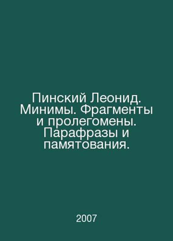 Pinsky Leonid. Minims. Fragments and prolegomenes. Paraphrases and memorabilia. In Russian /Pinskiy Leonid. Minimy. Fragmenty i prolegomeny. Parafrazy i pamyatovaniya. Writing under the pseudonyms Daniel Nipel, Alexander Kid, N. Lepin. Compilation, preparation of the text and notes by E.M. Lysenko, E.L. Pinskaya, L.D. Mazur-Pinskaya. St. Petersburg Publishing House Ivan Limbach. 2007. Contact us for details or to request photos of available books. Delivery of this book could take longer than normal due to additional handling time before shipping, and no rush delivery options are available. Please let us know if you have a specific date by which you need to receive your order. SKUalbdb78c1403992a096