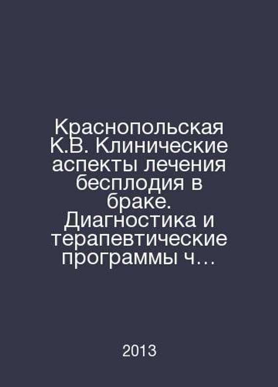 Krasnopolskaya K.V. Clinical Aspects of Matrimonial Infertility Treatment. Diagnostics and Therapeutic Programs with the Use of Natural Fertility Restoration Methods and Assisted Reproductive Technologies: A Guide In Russian /Krasnopolskaya K.V. Klinicheskie aspekty lecheniya besplodiya v brake. Diagnostika i terapevticheskie programmy ch ispolzovaniem metodov vosstanovleniya estestvennoy fertilnosti i vspomogatelnykh reproduktivnykh tekhnologiy: Rukovodstvo M. Geotar 2013.Contact us for details or to request photos of available books. Delivery of this book could take longer than normal due to additional handling time before shipping, and no rush delivery options are available. Please let us know if you have a specific date by which you need to receive your order.SKUalbde2f4b4b292d2df6