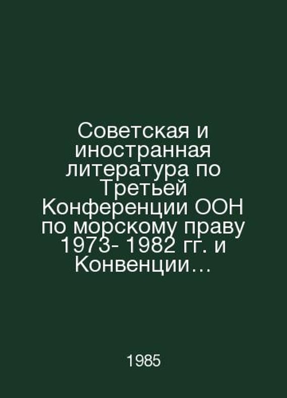 Soviet and Foreign Literature on the Third UN Conference on the Law of the Sea 1973-1982 and the 1982 UN Convention on the Law of the Sea, 1965-1984. In Russian /Sovetskaya i inostrannaya literatura po Tretey Konferentsii OON po morskomu pravu 1973- 1982 gg. i Konventsii OON po morskomu pravu 1982 g. Bibliograficheskiy ukazatel za 1965- 1984 gg. Co. I.Razumny, I.Efimovskiy. M.: Mortekhinformadvertising, 1985. Contact us for details or to request photos of available books. Delivery of this book could take longer than normal due to additional handling time before shipping, and no rush delivery options are available. Please let us know if you have a specific date by which you need to receive your order. SKUalbe0e227db4acf3759