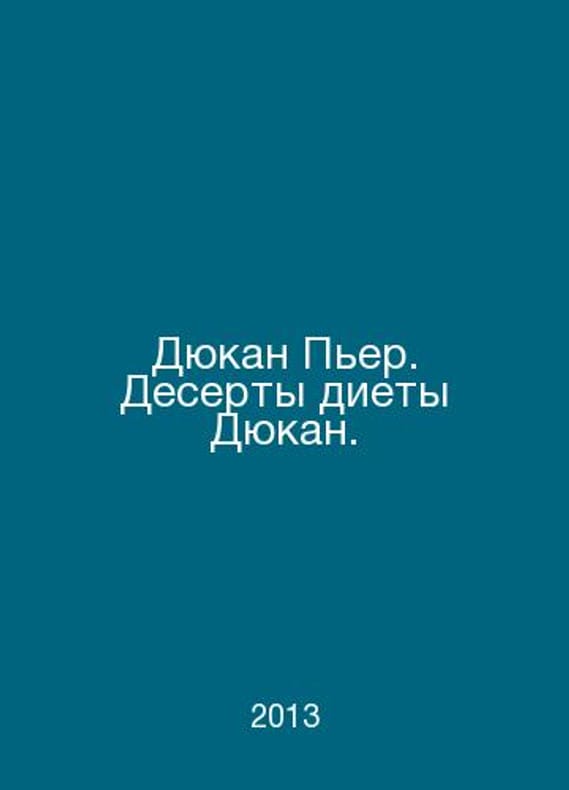 Dukan Pierre. Desserts of the Dukan diet. In Russian /Dyukan Per. Deserty diety Dyukan. Series: The Diet of Dr. Dukan. Translated from French by O.L. Alexandrova. Moscow. Exmo. 2013..Contact us for details or to request photos of available books. Delivery of this book could take longer than normal due to additional handling time before shipping, and no rush delivery options are available. Please let us know if you have a specific date by which you need to receive your order. SKUalbe1eeb5e9b205f9af
