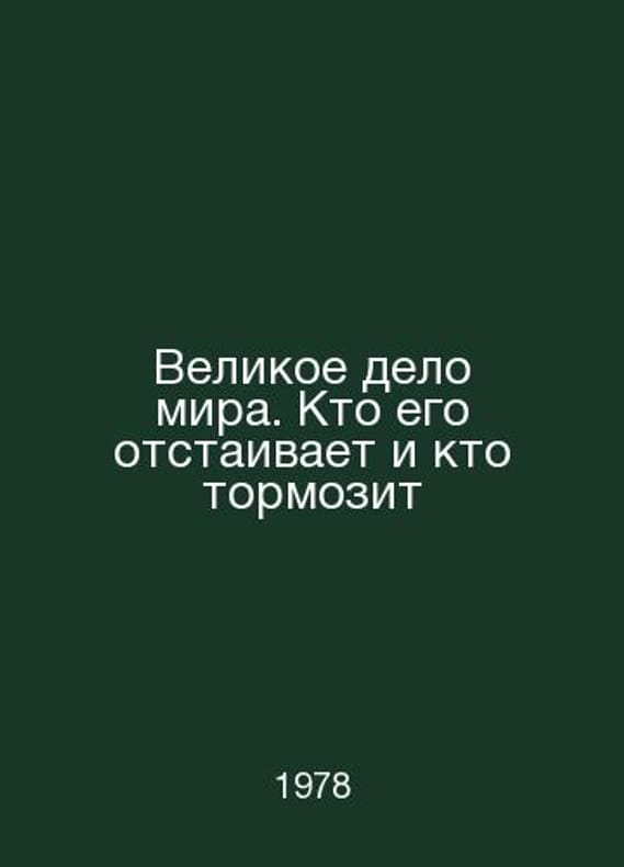 The great cause of peace: who defends it and who slows it down In Russian /Velikoe delo mira. Kto ego otstaivaet i kto tormozit Prague 1978.Contact us for details or to request photos of available books. Delivery of this book could take longer than normal due to additional handling time before shipping, and no rush delivery options are available. Please let us know if you have a specific date by which you need to receive your order.SKUalbe2a9ba7daf1955dc