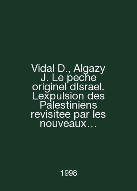 Vidal D., Algazy J. Le peche originel dIsrael. Expulsion des Palestiniens reviitee par les nouveaux historiens israeliens In English /Vidal D., Algazy J. Le peche originel dIsrael. Lexpulsion des Palestiniens revisitee par les nouveaux historiens israeliens Editions de lAtelier, 1998. Contact us for details or to request photos of available books. Delivery of this book could take longer than normal due to additional handling time before shipping, and no rush delivery options are available. Please let us know if you have a specific date by which you need to receive your order. SKUalbe2af0b02eba21f4d