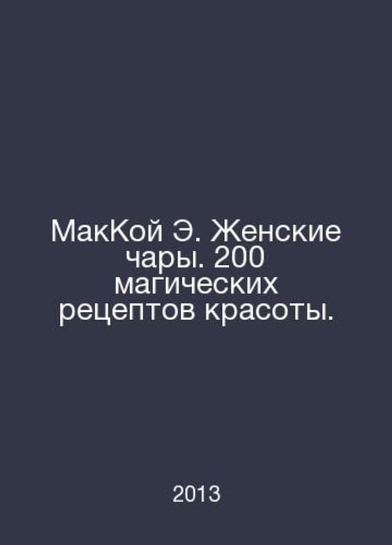 McCoy E. Female Enchantment. 200 Magic Recipes for Beauty. In Russian /MakKoy E. Zhenskie chary. 200 magicheskikh retseptov krasoty. Series: The Enchantress. St. Petersburg. All. 2013 year.Contact us for details or to request photos of available books. Delivery of this book could take longer than normal due to additional handling time before shipping, and no rush delivery options are available. Please let us know if you have a specific date by which you need to receive your order.SKUalbe4768294f04a046e