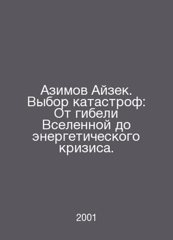 Asimov Isaac: The Choice of Catastrophes: From the Destruction of the Universe to the Energy Crisis. In Russian /Azimov Ayzek. Vybor katastrof: Ot gibeli Vselennoy do energeticheskogo krizisa. Series: Eureka. Translation from English. St. Petersburg. Amphora 2001. Contact us for details or to request photos of available books. Delivery of this book could take longer than normal due to additional handling time before shipping, and no rush delivery options are available. Please let us know if you have a specific date by which you need to receive your order.SKUalbe5091c17f028c24c