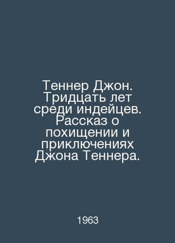 Tenner John. Thirty Years among Indians. The Story of John Tenners Kidnapping and Adventures. In Russian /Tenner Dzhon. Tridtsat let sredi indeytsev. Rasskaz o pokhishchenii i priklyucheniyakh Dzhona Tennera. Foreign Literature 1963.Contact us for details or to request photos of available books. Delivery of this book could take longer than normal due to additional handling time before shipping, and no rush delivery options are available. Please let us know if you have a specific date by which you need to receive your order.SKUalbe55b471ebbc3dc36