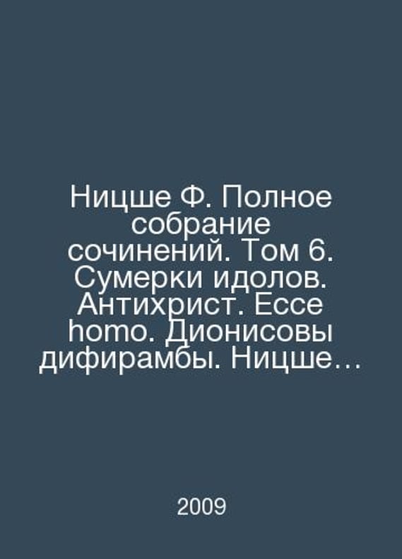 Nietzsche F. Complete collection of works. Volume 6. The Twilight of Idols. Antichrist. Ecce homo. Dionysus diphyrambes. Nietzsche contra Wagner In Russian /Nitsshe F. Polnoe sobranie sochineniy. Tom 6. Sumerki idolov. Antikhrist. Ecce homo. Dionisovy difiramby. Nitsshe contra Vagner M. Cultural Revolution 2009.Contact us for details or to request photos of available books. Delivery of this book could take longer than normal due to additional handling time before shipping, and no rush delivery options are available. Please let us know if you have a specific date by which you need to receive your order.SKUalbe653e908ea811281
