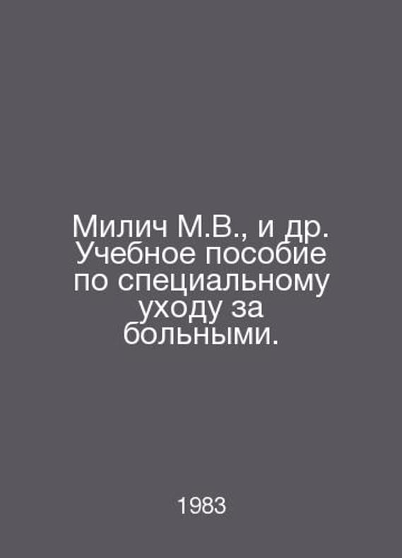 Milic M.V. et al. Training Manual for Special Care. In Russian /Milich M.V., i dr. Uchebnoe posobie po spetsialnomu ukhodu za bolnymi. M Medicine 1983.Contact us for details or to request photos of available books. Delivery of this book could take longer than normal due to additional handling time before shipping, and no rush delivery options are available. Please let us know if you have a specific date by which you need to receive your order.SKUalbe77568479476b4c7