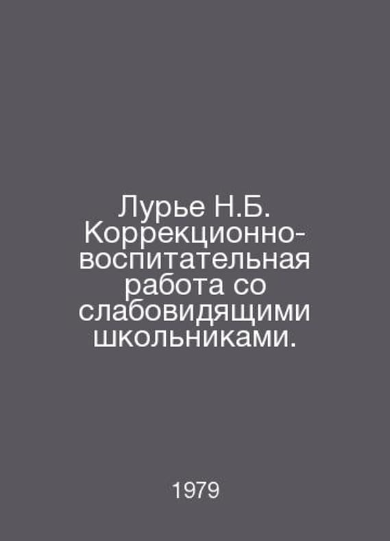 Lourier N.B. Correctional and educational work with visually impaired schoolchildren. In Russian /Lure N.B. Korrektsionno-vospitatelnaya rabota so slabovidyashchimi shkolnikami. M Education 1979.Contact us for details or to request photos of available books. Delivery of this book could take longer than normal due to additional handling time before shipping, and no rush delivery options are available. Please let us know if you have a specific date by which you need to receive your order.SKUalbe7e4252f554e5e9c