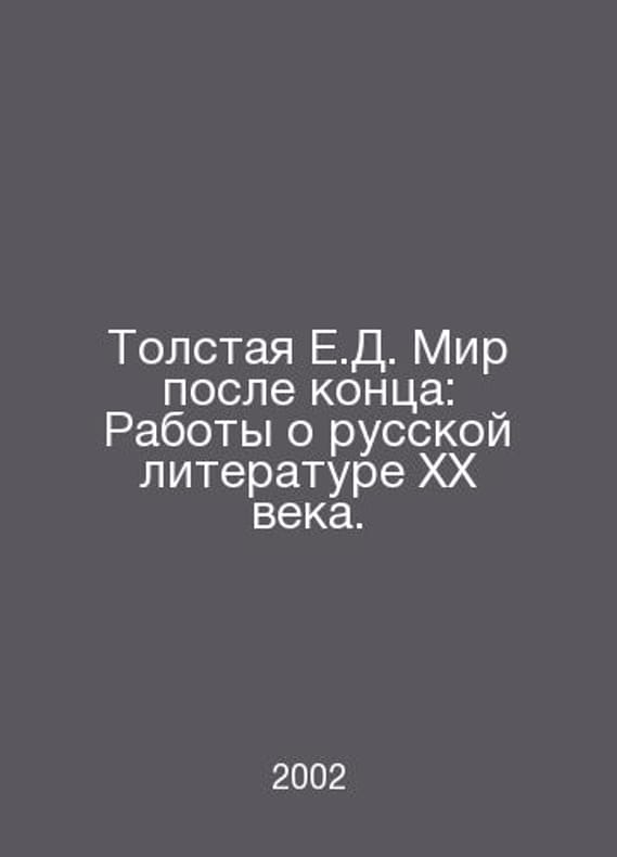Tolstaya E.D. The World After the End: Works on Russian Literature of the 20th Century. In Russian /Tolstaya E.D. Mir posle kontsa: Raboty o russkoy literature XX veka. Russian State University for the Humanities Moscow 2002. Contact us for details or to request photos of available books. Delivery of this book could take longer than normal due to additional handling time before shipping, and no rush delivery options are available. Please let us know if you have a specific date by which you need to receive your order. SKUalbf0c89b7daf8947e0