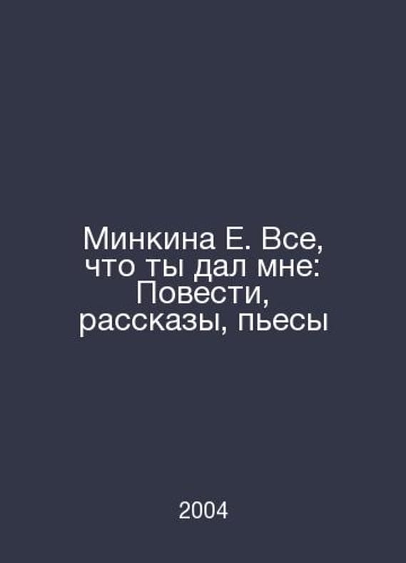 Minkina E. All You Gave Me: Stories, Stories, Plays In Russian /Minkina E. Vse, chto ty dal mne: Povesti, rasskazy, pesy St. Petersburg. Retro 2004.Contact us for details or to request photos of available books. Delivery of this book could take longer than normal due to additional handling time before shipping, and no rush delivery options are available. Please let us know if you have a specific date by which you need to receive your order.SKUalbf32b4ee2fbd6eddc